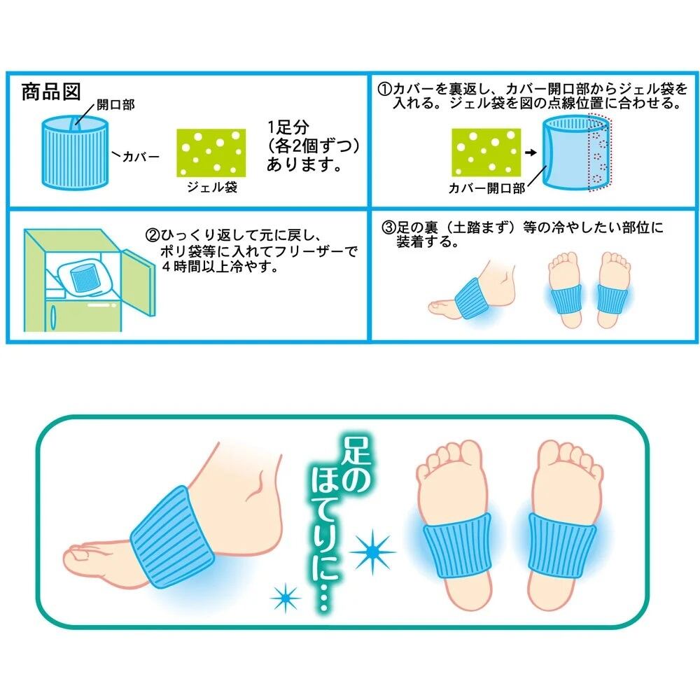 ●フリーザーで冷やす凍結しないジェル袋を、ニットのカバーにセットして使う商品で、疲れてほてった足に心地よい冷感を与えてくれます。