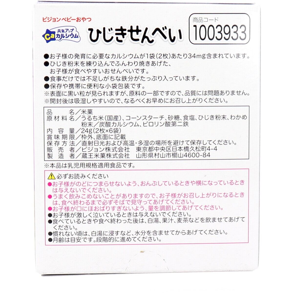 (赤ちゃんのおやつに)ピジョン 元気アップ カルシウム ひじきせんべい 2枚×6袋